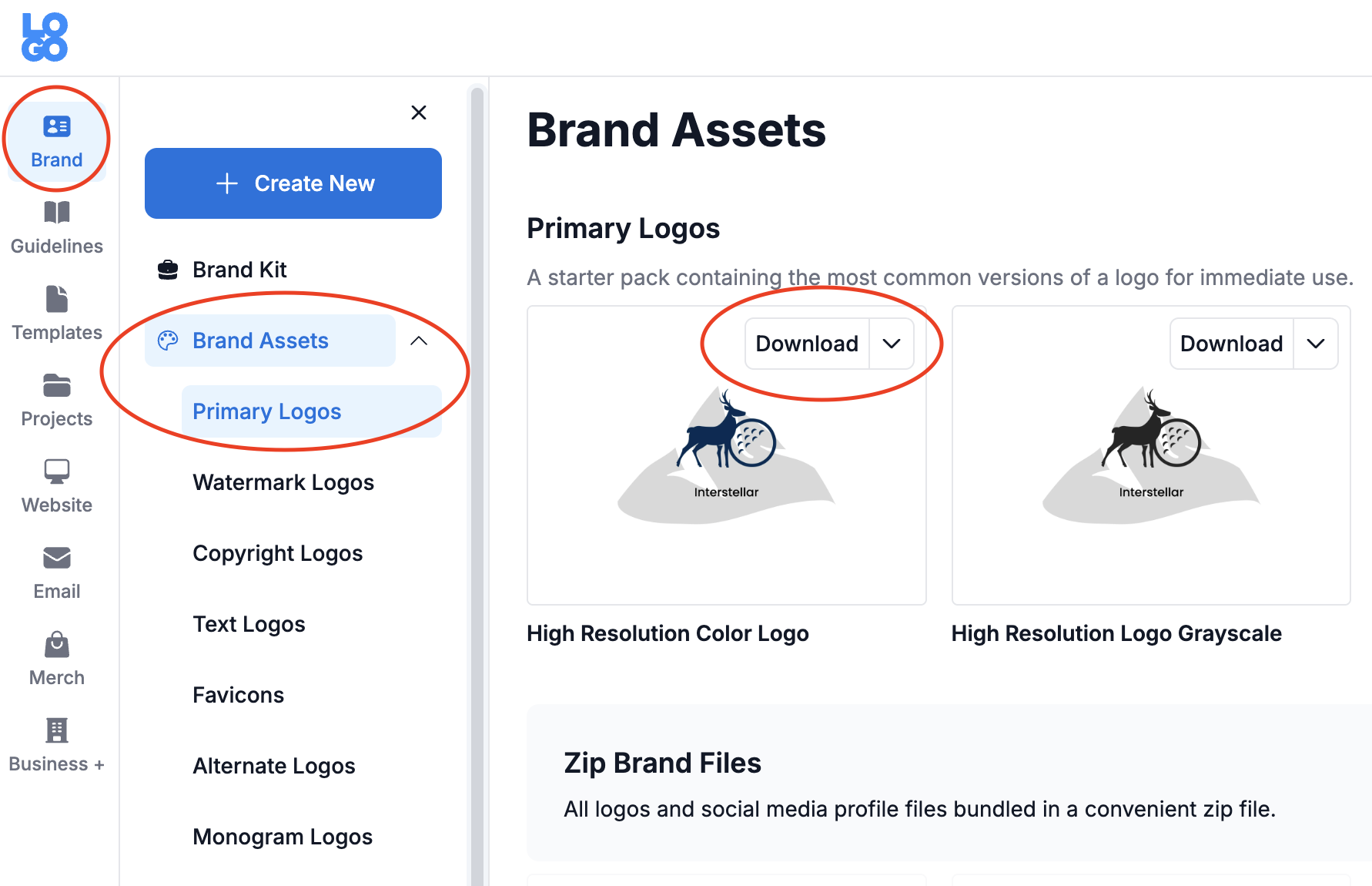 - To download different variants of your logo, scroll down Brand Assets to the various sections and click on the corresponding download button under the logo you want to download.