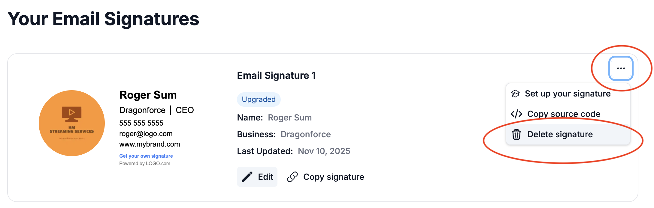 - On the email signature page, click on the three dot menu at the top right of the email signature